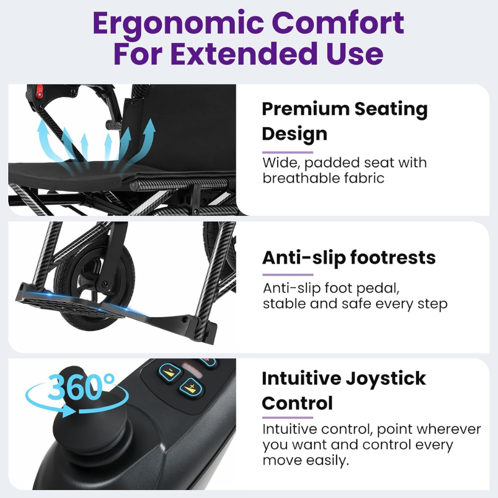 Designed with safety as a top priority, this power wheelchair features anti-tip wheels, a lighting system, and reliable braking performance. These elements ensure stability, visibility, and user confidence — ideal for seniors or anyone with limited mobility.