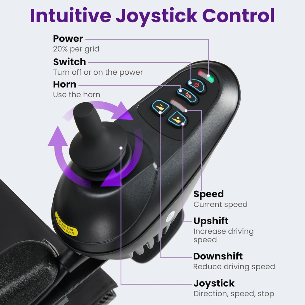 The advanced 360° joystick offers smooth, precise handling and effortless maneuvering in tight indoor areas or outdoor paths. Designed for user comfort and control, it allows you to move freely and confidently.