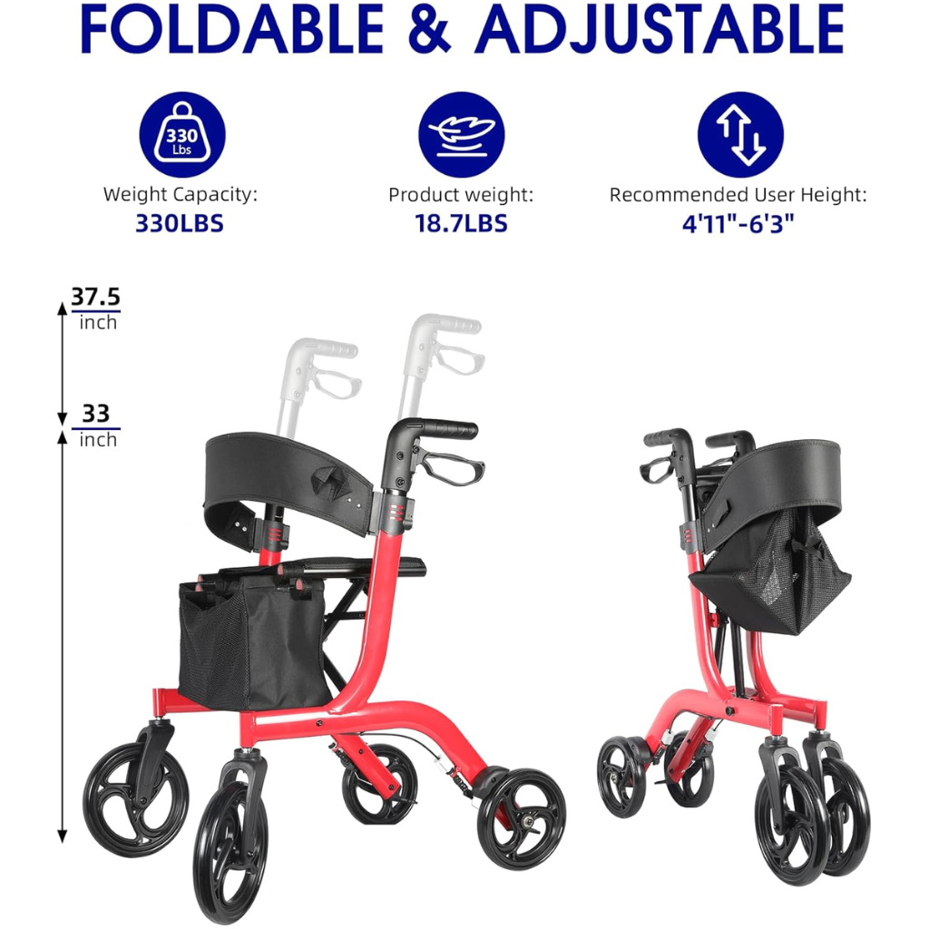 Foldable Rollator Walker for Seniors & Adults with Seat – Lightweight 19 lbs, Supports 300 lbs, Adjustable Arm Height, 10" All-Terrain Wheels, Compact Design for Easy Storage and Travel
